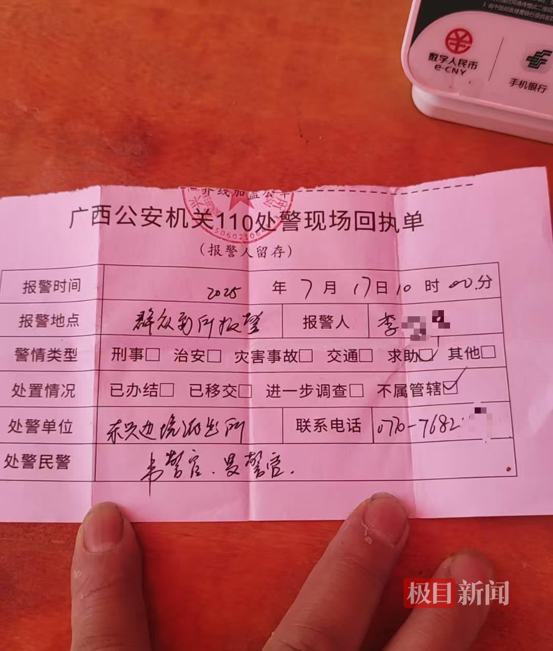 李尉标最后出现在监控中是在东兴市深沟社区,广西公安机关110处警现场回执单显示,李先生到东兴边境派出所求助,处置情况是“不属管辖”。