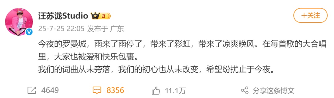 7月25日晚,@汪苏泷工作室 发文:“今夜的罗曼城,雨来了雨停了,带来了彩虹,带来了凉爽晚风。在每首歌的大合唱里,大家也被爱和快乐包裹。我们的词曲从未旁落,我们的初心也从未改变,希望纷扰止于今夜。 ”