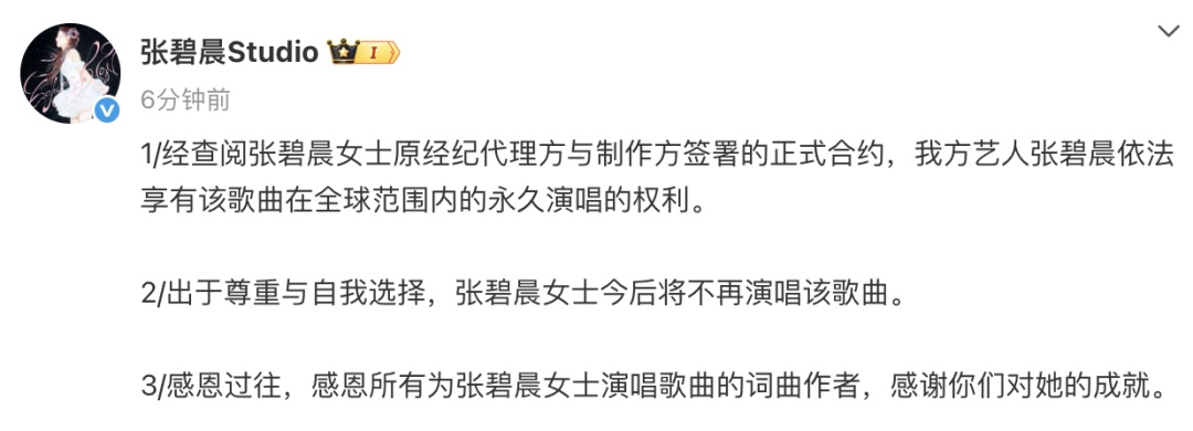 7月25日,@张碧晨Studio 发文回应:“1、经查阅张碧晨女士原经纪代理方与制作方签署的正式合约,我方艺人张碧晨依法享有该歌曲在全球范围内的永久演唱的权利。