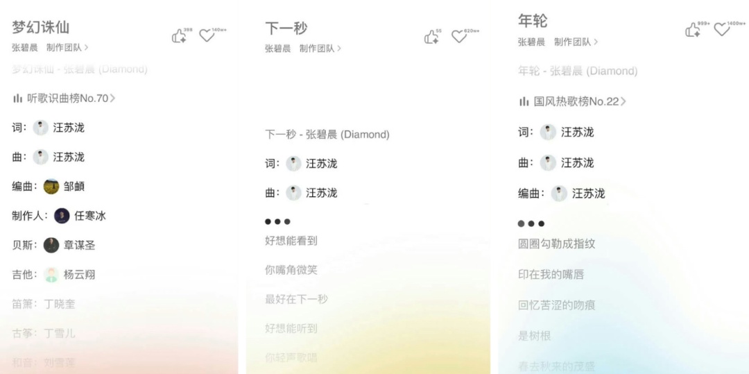 经查询,张碧晨一共演唱过汪苏泷作词作曲的三首歌,分别是《年轮》《下一秒》《梦幻诛仙》。