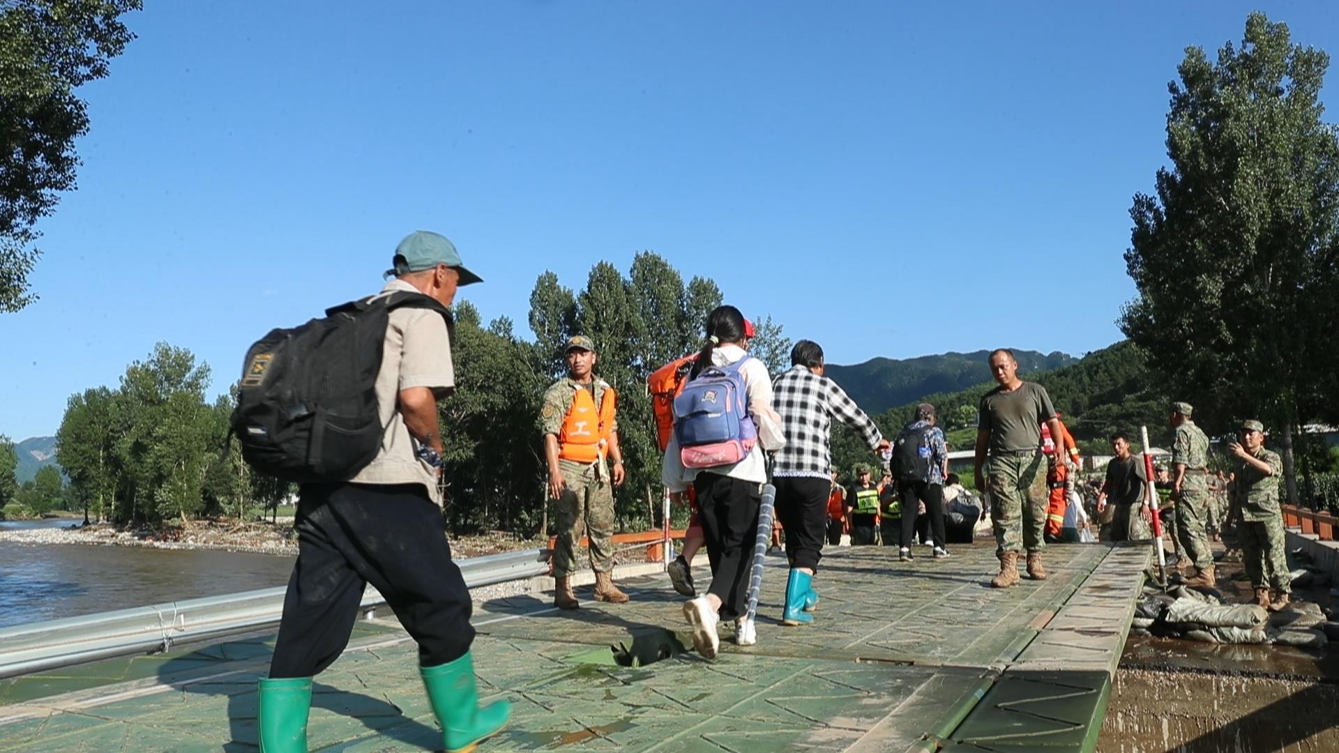 7月29日17时许,在河北省承德市滦平县马营子满族乡,一座“钢铁大桥”横跨被洪水冲毁的王北沟门桥两岸,西沟村百余名受困群众相互搀扶,踏上这条刚刚抢通的“生命通道”。