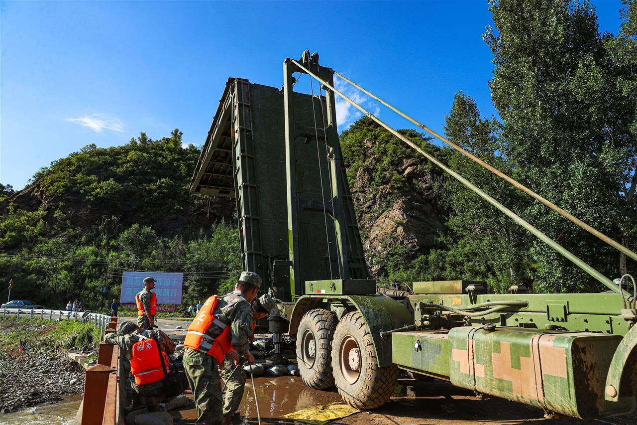 当救援队伍抵近营子村时,一座被拦腰折断的桥梁横亘在官兵面前。受洪水影响,这座王北沟门桥的桥面被冲毁,残余的桥墩摇摇欲坠,湍急的河流肆意奔腾,任务分队指挥员眉头紧锁、语气坚定:“桥梁分队,架桥!”