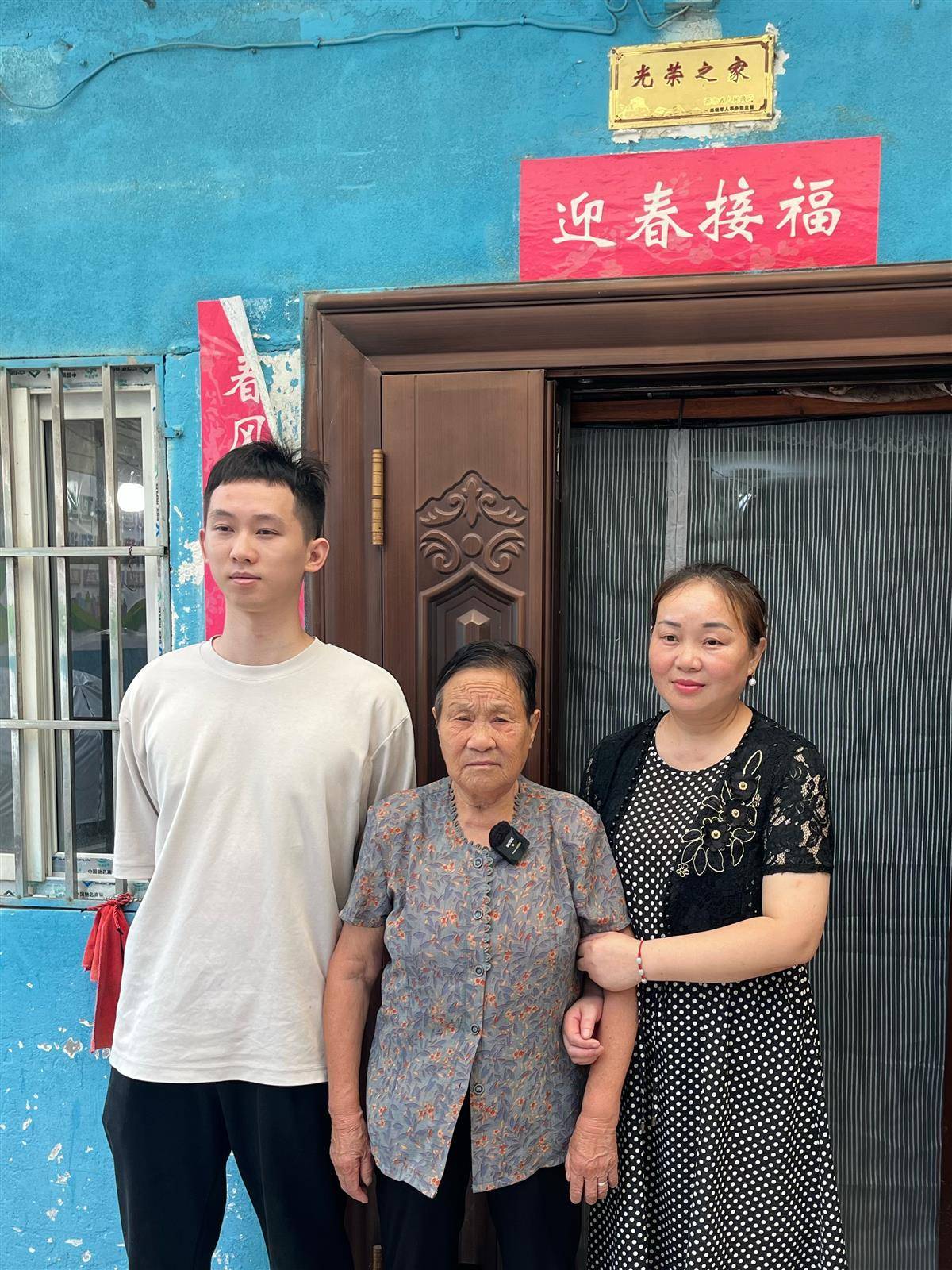 唐贤美与小女儿陈秀华及孙子在家门口。