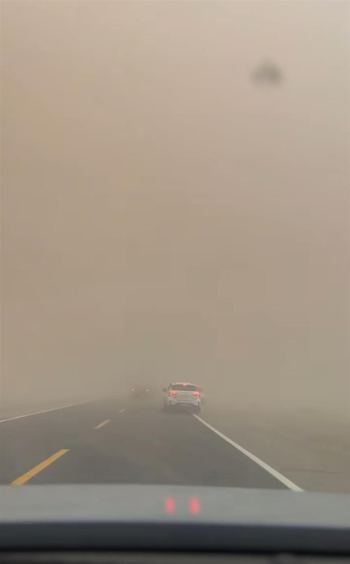 视频显示,在笔直的公路上,百米高的沙墙扑面而来,倒向路面。车辆驶入沙尘后,能见度瞬间降低,过往车辆纷纷减速并打起双闪,还有车辆临时靠边停车。