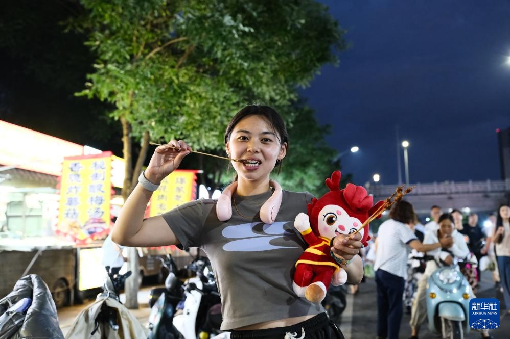 在内蒙古赤峰市,抱着赛事吉祥物“赤龙儿”玩偶的游客在夜市上品尝美食(7月25日摄)。新华社记者 马金瑞 摄