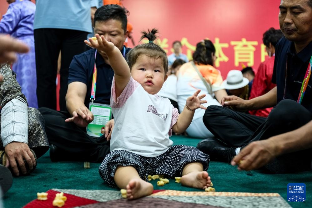 在内蒙古赤峰市赤峰体育中心,一名小朋友在体验投掷沙嘎(7月29日摄)。新华社记者 马金瑞 摄