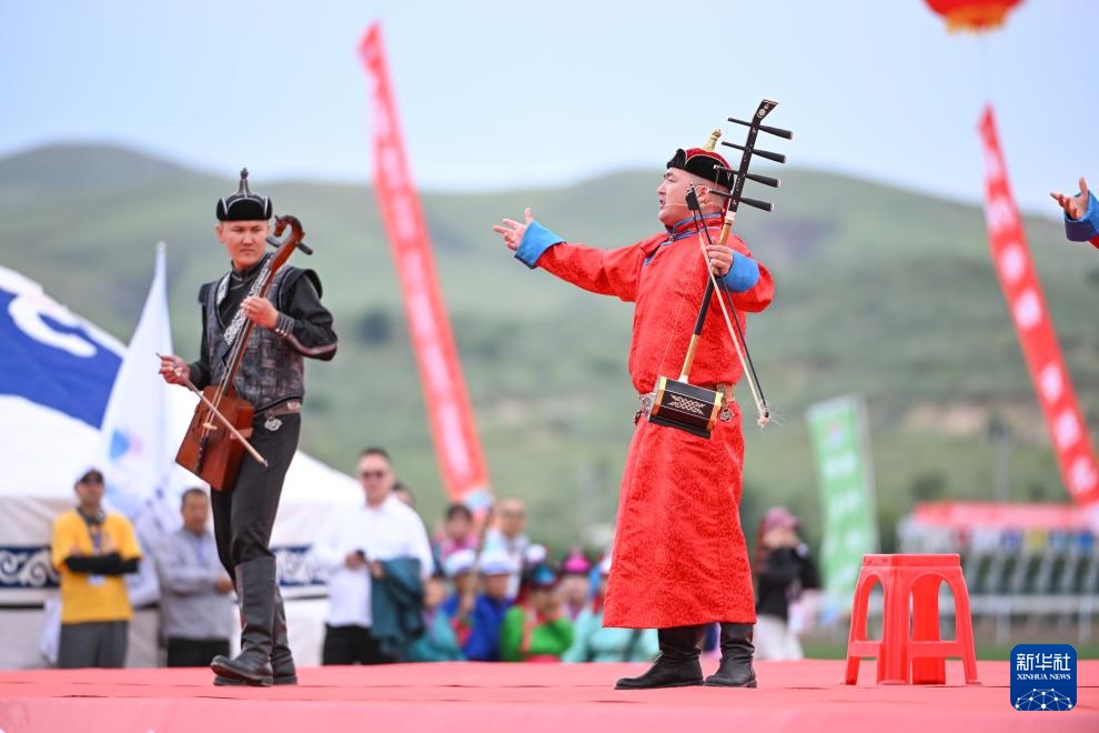 演员在内蒙古自治区第十一届少数民族传统体育运动会(巴林右旗分赛场)开赛仪式上表演(7月20日摄)。新华社记者 贝赫 摄
