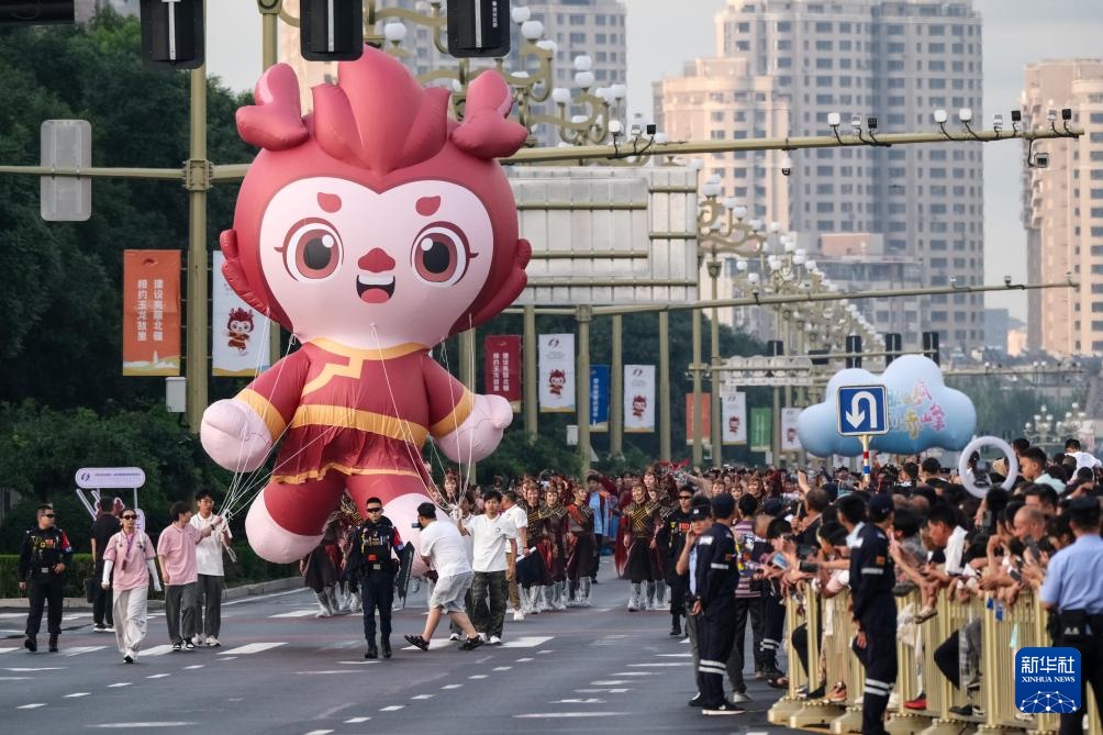 在内蒙古赤峰市,赛事吉祥物“赤龙儿”玩偶在民族联欢花车游行中亮相(7月29日摄)。新华社记者 马金瑞 摄
