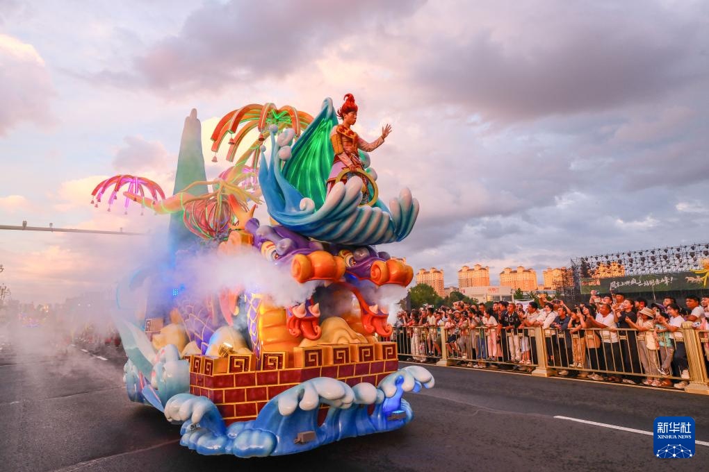 在内蒙古赤峰市,演员在民族联欢花车巡游中与观众互动(7月29日摄)。新华社记者 马金瑞 摄