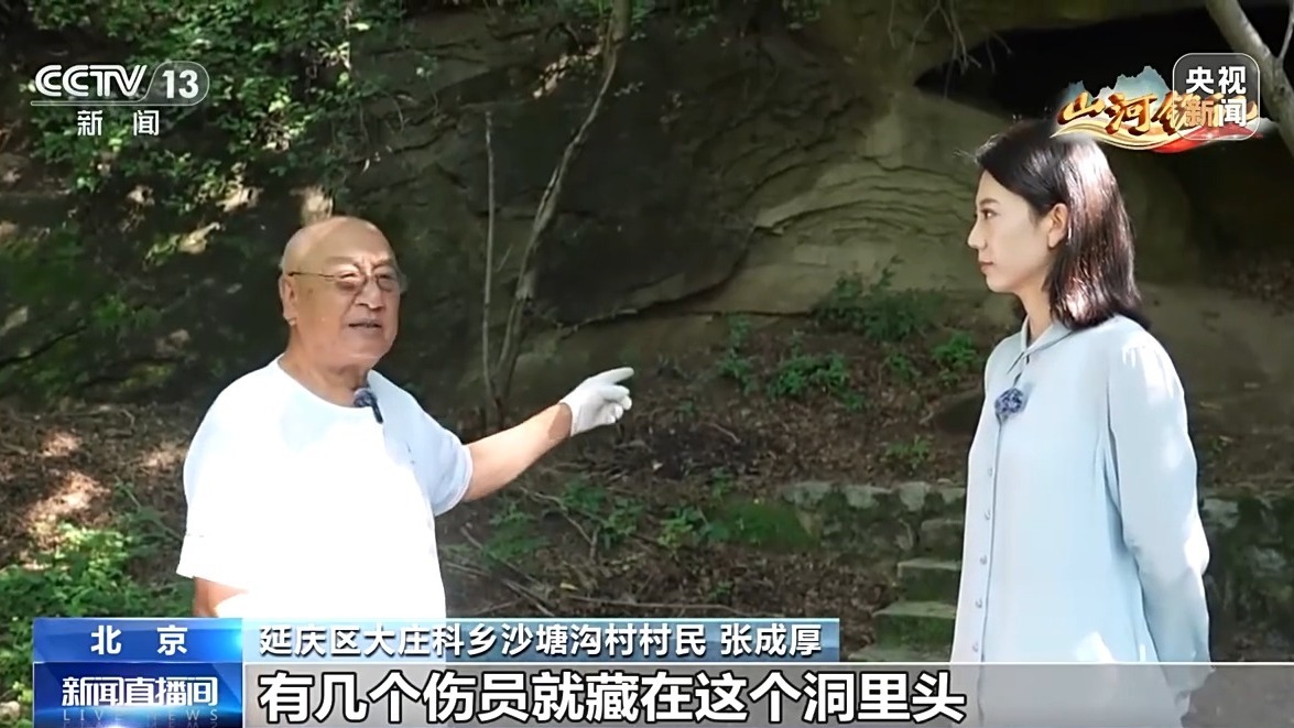 总台央视记者 张安琪:我们前面这个山洞就是当年的藏粮洞。刚刚我们走了一小段山路来到这里,因为这在一个半山腰的位置,它是相对来说比较隐蔽的。当年老百姓们就是在这里为八路军积攒军粮的。我身旁的张成厚爷爷,他的哥哥当年就曾经参与过藏粮活动。