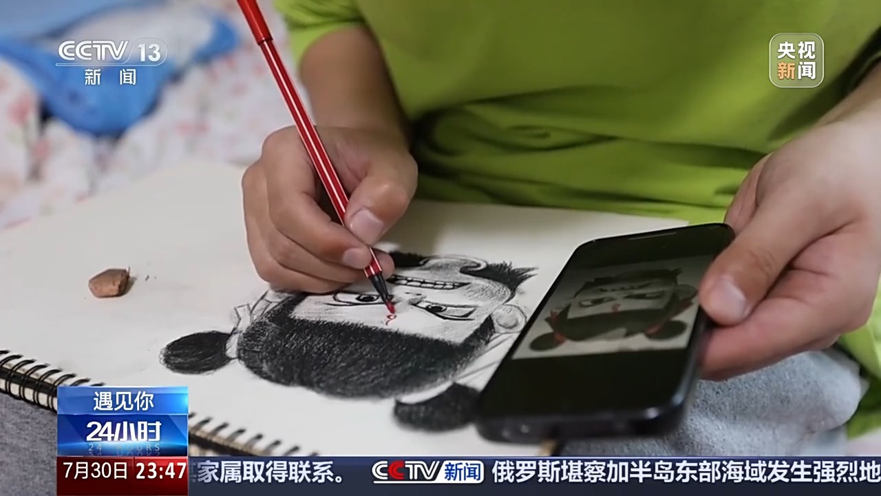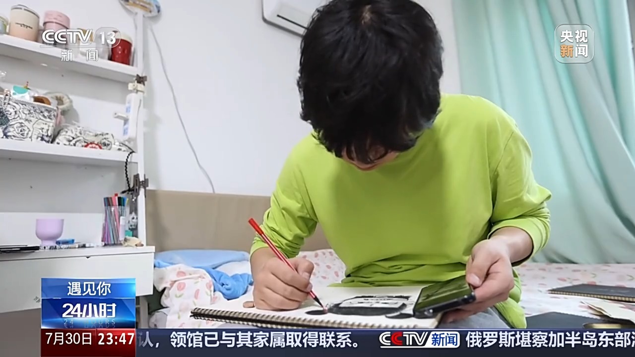 今年上映的电影《哪吒之魔童闹海》,一飞特别喜欢,剧中的哪吒在一飞的画笔下惟妙惟肖。沉浸在无声但多彩的绘画世界中,一飞很享受。