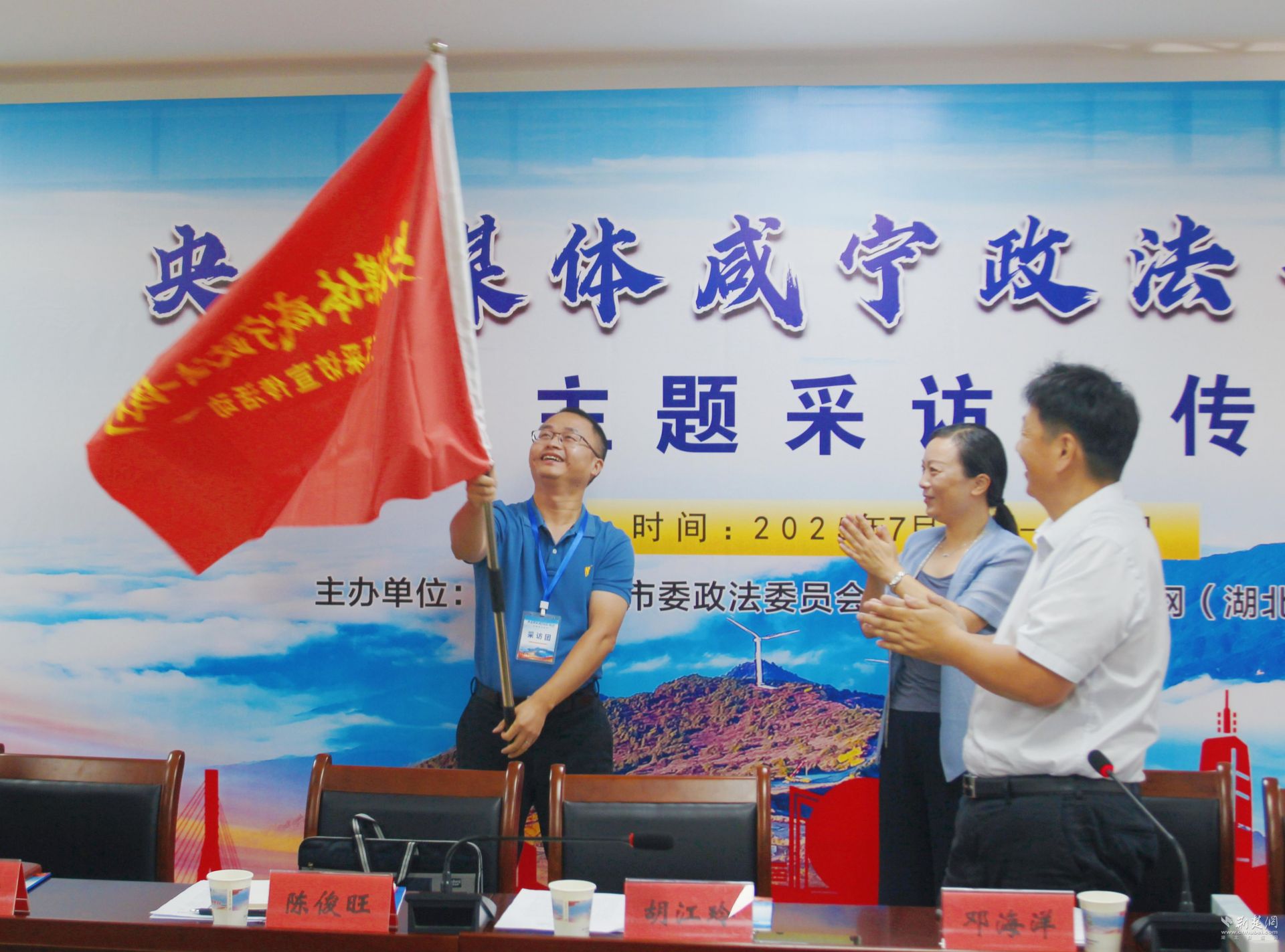 为“央省媒体咸宁政法一线行”采访团授旗。实习生 郭芷岑 摄