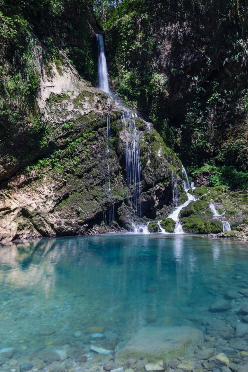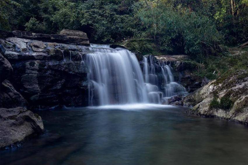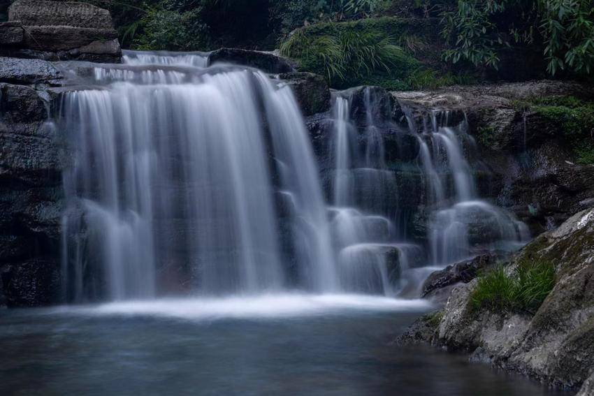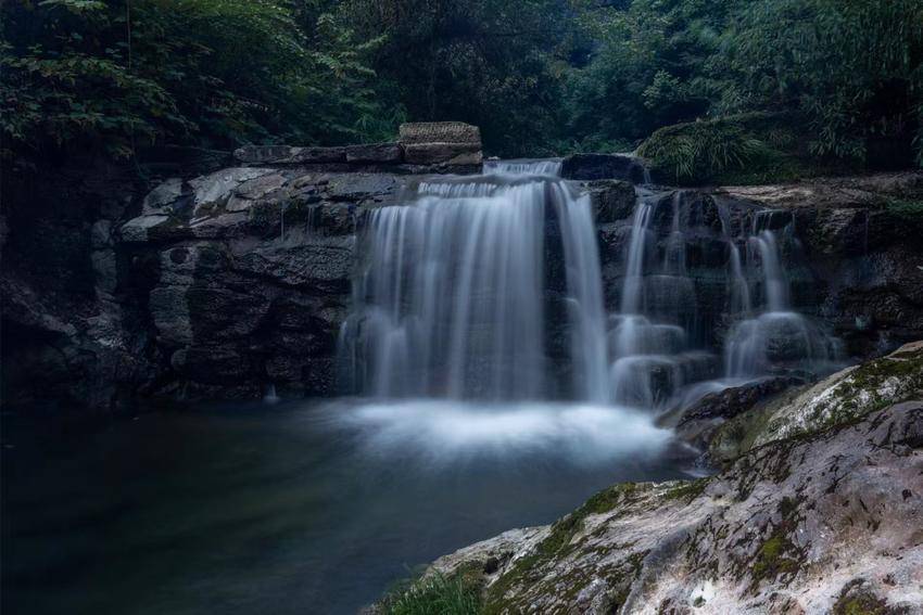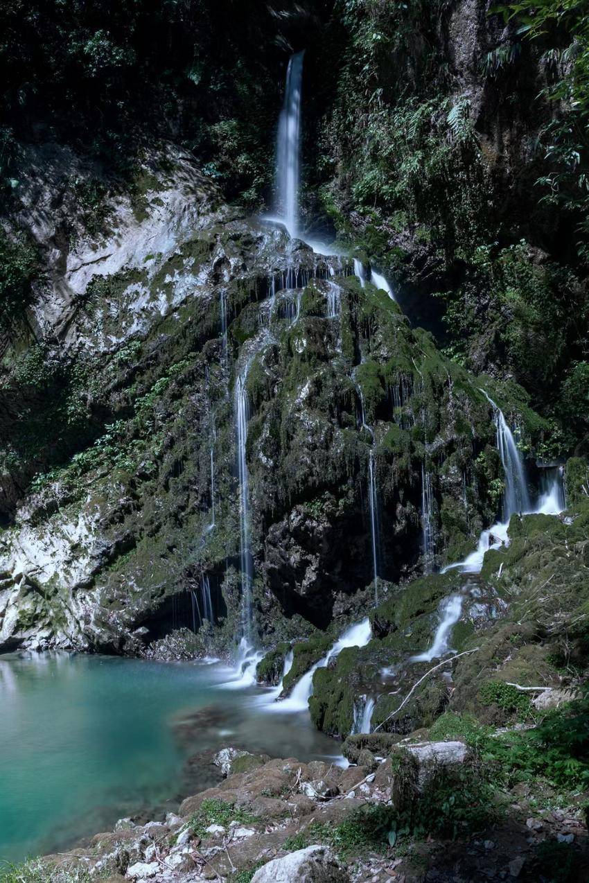 银河从九天落了下来,碎成了峡谷里的小瀑布,像素洁的绸缎,覆于层次分明的青石与苔藓之上,慢慢地滑落,被深滩稳稳接住。