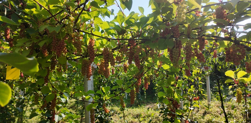 王成尧的转型并非一时兴起。此前他在建筑行业打拼多年,事业风生水起,但每次回乡看到撂荒的土地,总觉“心里空了一块”。2022年3月,他毅然带着资金和技术返乡,成立“成尧种养殖专业合作社”,一次性流转120亩闲置土地。“荒着太可惜,不如种点果子带乡亲们试试!”他笑着回忆初衷。王成尧看中仙侣山海拔高、云雾多、土壤好的天然优势,经过多方考察和调研引进优质种苗,摸索出一套“土办法”。仿野生管理,藤架依山而搭,保留原生树林遮阴,全程人工除草,坚决不用除草剂;以虫治虫、以音防鸟,悬挂诱虫板、投放赤眼蜂,替代农药防虫害,在田间设置音响用猫叫和老鹰叫声防止小鸟偷吃果子,最大程度保证果子的品质。