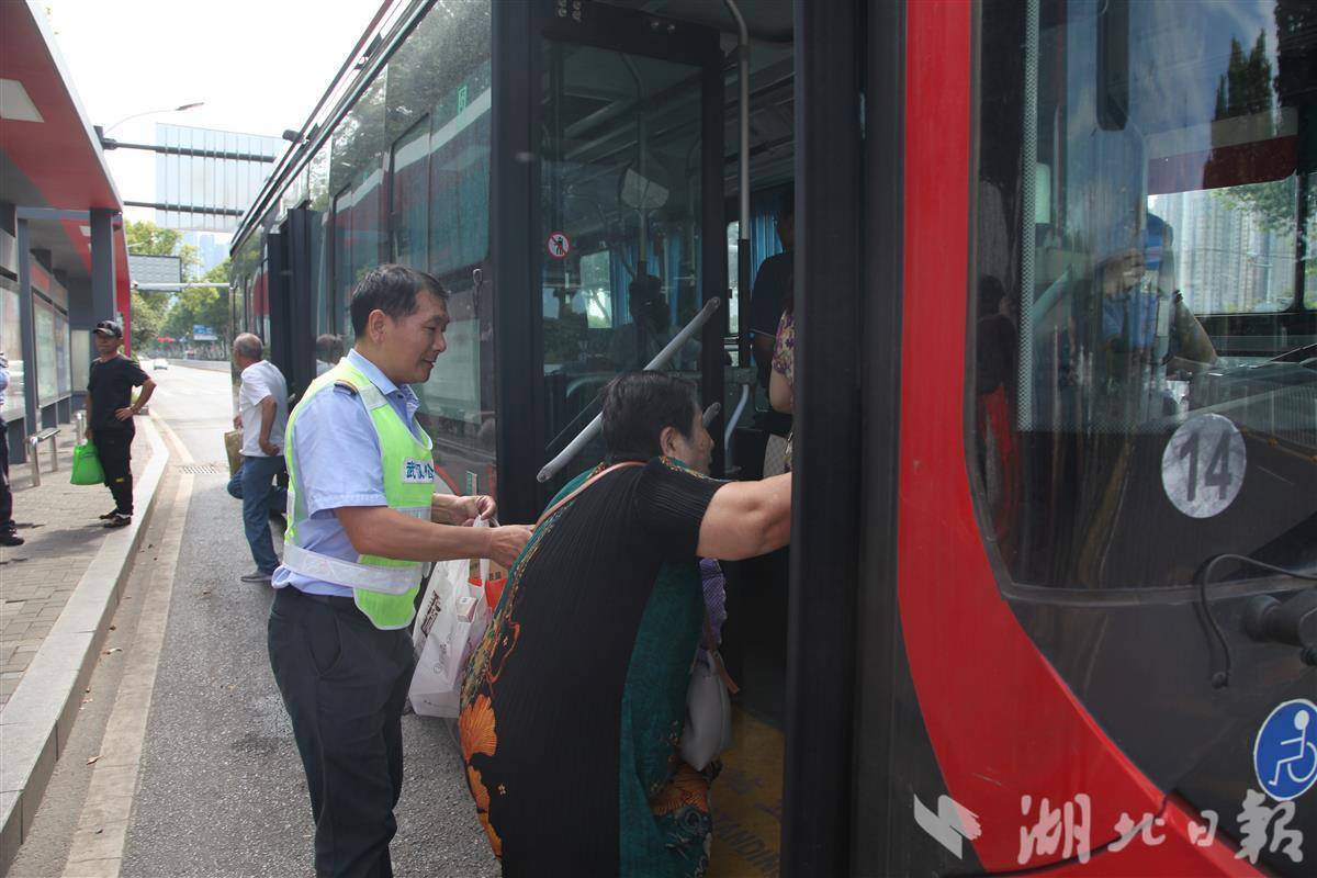 湖北日报讯(通讯员 涂举学、朱仁惠、曾海超)7月31日,武汉公交六公司555路司机朱新民在和平大道建设十路公交站开展志愿服务,主动为有需要的乘客拎取行李,热情的身影在站台传递着暖意。