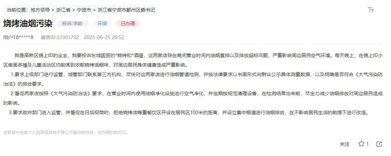 对此,宁波高新区综合行政执法队高度重视,第一时间开展核查。据调查了解,在接到网友投诉前,当地环保部门委托的第三方机构已对上述两家店铺进行了油烟排放监测,检测内容涵盖排放浓度、净化设备运行状况等多个方面。