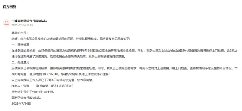 2025年7月4日,执法队工作人员已通过电话与反映问题的网友取得联系并反馈处理情况,网友对目前的整改进展表示理解与认可。执法队相关负责人表示,后续将加强对辖区餐饮油烟污染的监管力度,切实维护居民生活环境质量。