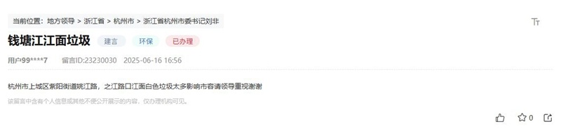 “钱塘江江面垃圾太多”“店铺油烟直排污染环境”“小区内垃圾未能及时分类、有效回收”……近日,多位浙江网友在人民网“领导留言板”上发帖,反映各地生态环境问题。针对群众留言反映的情况,浙江相关部门迅速响应,解决群众诉求。