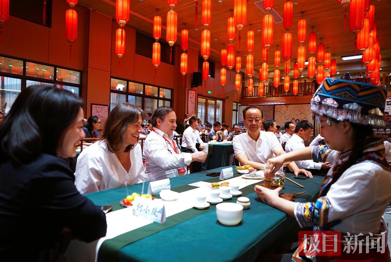 7月31日晚,“来凤藤茶 茶引未来”品茗会在湖北来凤举行,来自尼泊尔、丹麦、意大利等国的外宾与中国茶人齐聚,共赏藤茶风味,体验中华茶道千年雅韵。