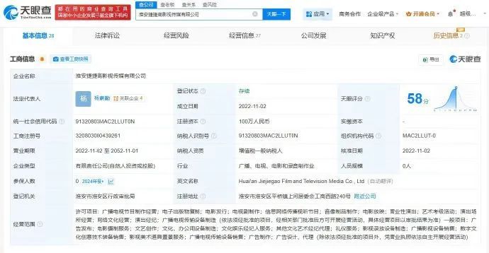 张馨予还将何捷名字写进公司名称。天眼查App显示,张馨予(本名张燕)名下关联2家企业,仅淮安捷捷高影视传媒有限公司为存续状态。该公司成立于法定代表人为张馨予母亲杨素勤,监事为何建军,注册资本100万人民币,经营范围为营业性演出、演出经纪、文化娱乐经纪人服务等,由张燕和杨素勤分别持股70%、30%。