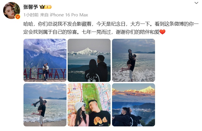 8月1日,演员张馨予在社交平台上发布与何捷的合影,配文:“你们总说我不发合影藏着,今天是纪念日,大方一下······七年一晃而过,谢谢你们的陪伴和爱。”