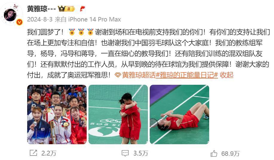 在黄雅琼个人社交平台的置顶消息中,仍包括奥运夺冠瞬间,当时她留言“我们圆梦了!”
