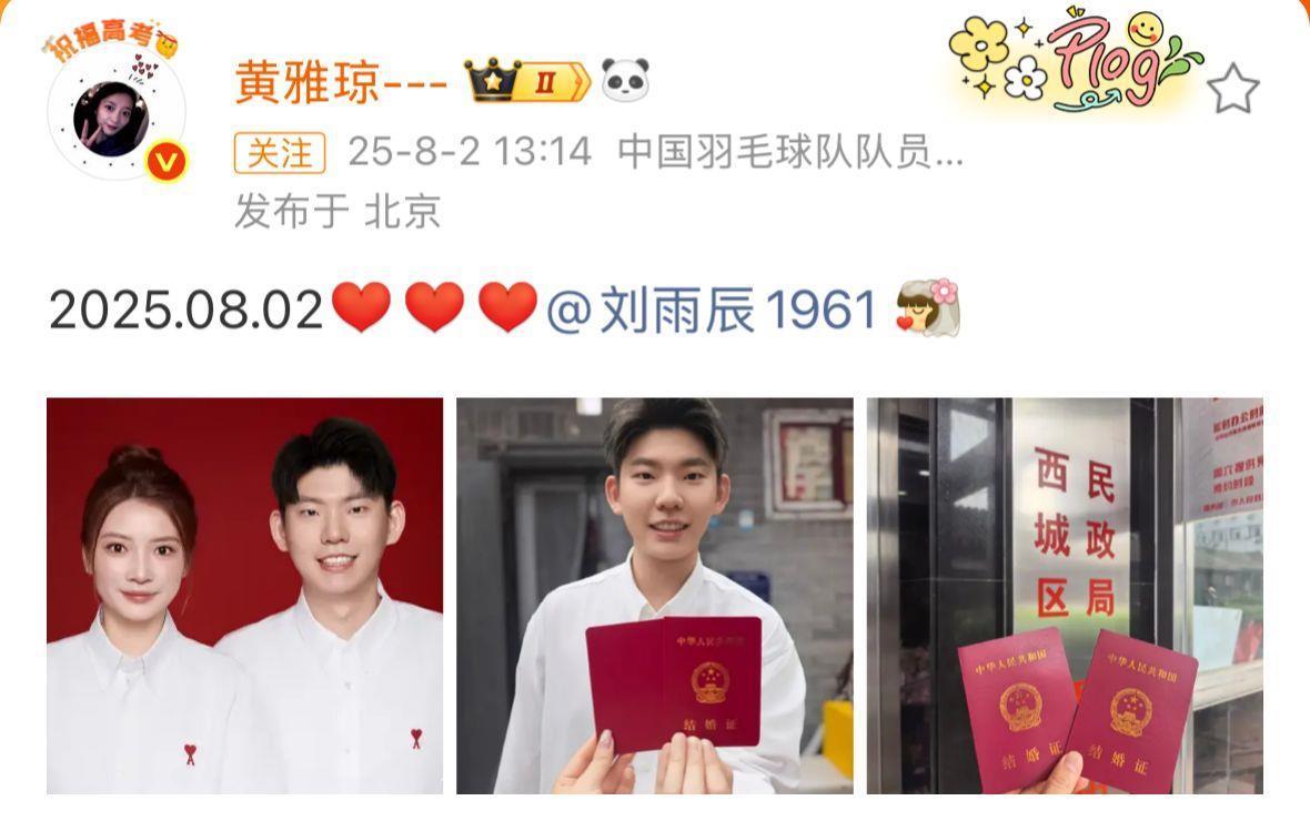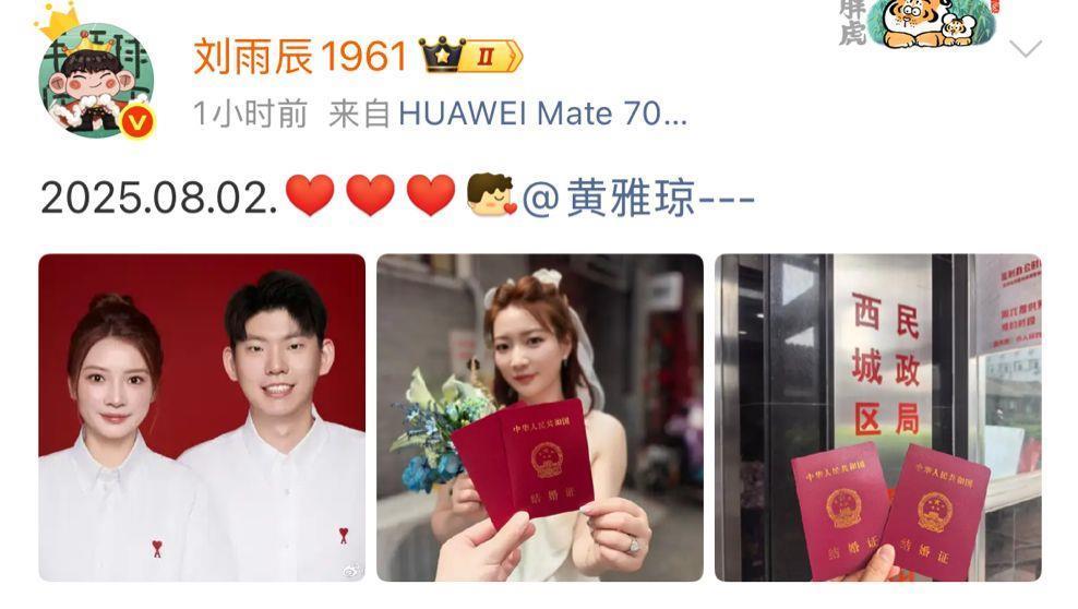 一年后的今天,即2025年8月2日,黄雅琼、刘雨辰齐齐官宣领证结婚。