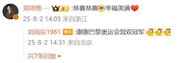 刘雨辰俏皮回复:谢谢巴黎奥运会混双冠军。