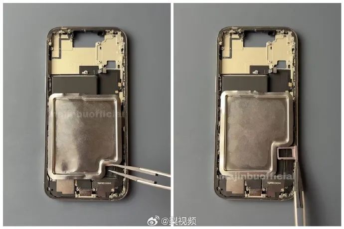 如图所示,iPhone 17 Pro采用L型电池,电池外表使用钢制外壳,以此来提高散热效率。