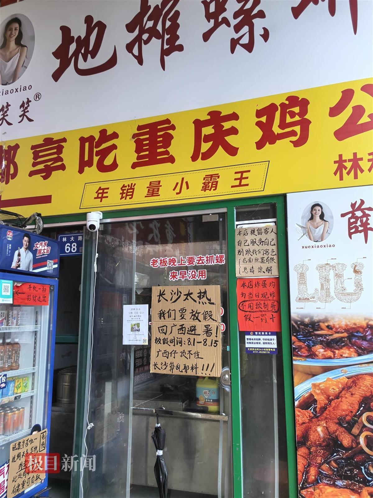 8月4日中午12时许,长沙艳阳高照,气温超过37℃,步行一会儿就大汗淋漓。正值午餐高峰期,极目新闻记者来到长沙市林大路常青藤商业街,位于角落里的螺蛳粉店确实已经暂停营业。在玻璃门上挂着一张用纸壳写的通知:“长沙太热,我们要放假回广西避暑,广西仔顶不住。放假时间为8月1日至8月15日”。