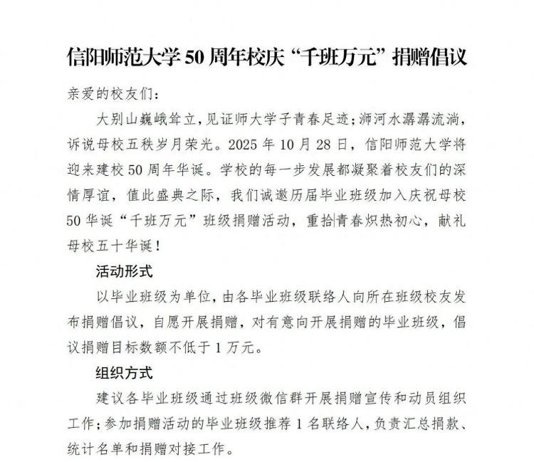 “诚邀历届毕业班级加入庆祝母校50华诞'千班万元'班级捐赠活动,重拾青春炽热初心,献礼母校五十华诞!”据媒体报道,信阳师范大学近日在往年毕业生中发起“千班万元”捐赠倡议,对有意向捐赠的毕业班级,倡议捐赠目标数额不低于1万元。针对不同额度的捐款,校方将对捐款校友进行不同程度的答谢。这一倡议迅速引发网友质疑。