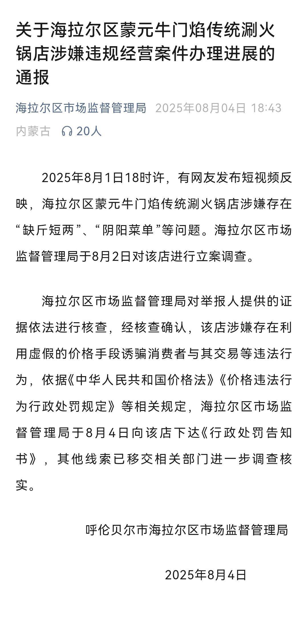 8月4日,海拉尔区市场监管局发布的通报内容显示,对于网友发布短视频反映的海拉尔区蒙元牛门焰传统涮火锅店涉嫌存在的“缺斤短两”“阴阳菜单”等问题,该单位已对门店进行立案调查。经核查确认,店铺涉嫌存在利用虚假价格手段诱骗消费者与其交易等违法行为,已对店铺下达《行政处罚告知书》,并移交相关部门进一步处理。