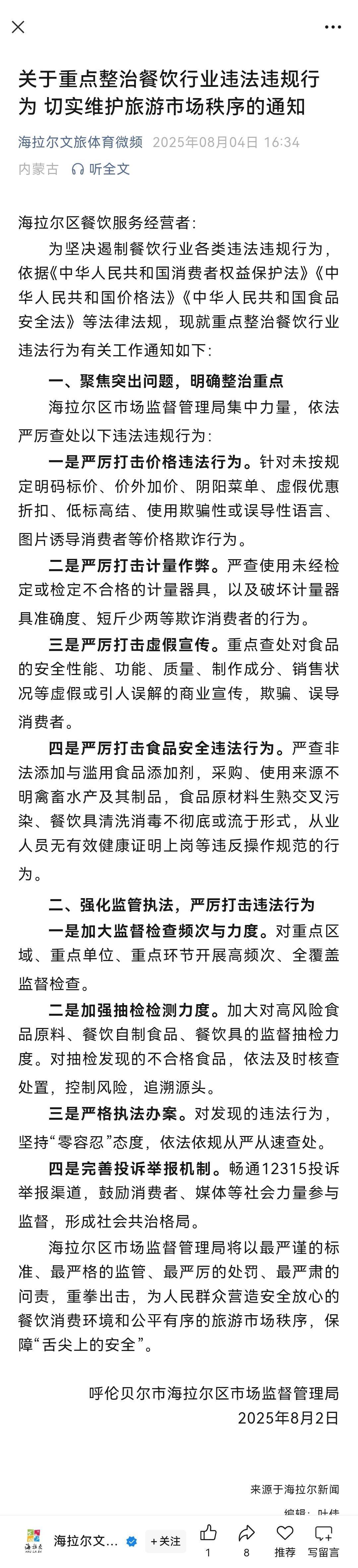 同日,海拉尔市场监管局发布《关于重点整治餐饮行业违法违规行为 切实维护旅游市场秩序》的通知,内容提到:严厉打击价格违法行为、计量作弊、虚假宣传、食品安全违法行为。