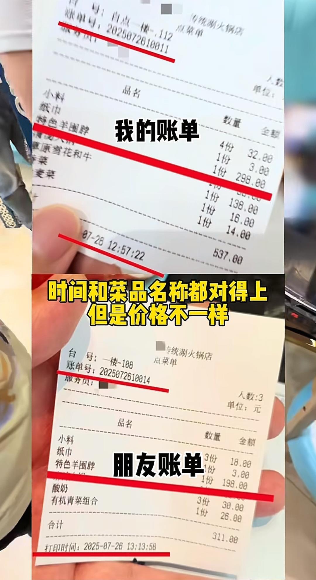 王大锤发文称,对比自己桌上菜单的菜品价格和海拉尔本地朋友桌的菜品,每道菜价格都不一样。同样的菜品羊围脖,本地客人价格为198元,相比外地游客菜单相差100元,菜品分量也比服务员宣称的三斤二两,少了八两多。王大锤向店内其他餐桌的多名外地游客询问后得知,他们菜单上不少菜品的价格,与本地客人菜单上的对应菜品价格存在差距。
