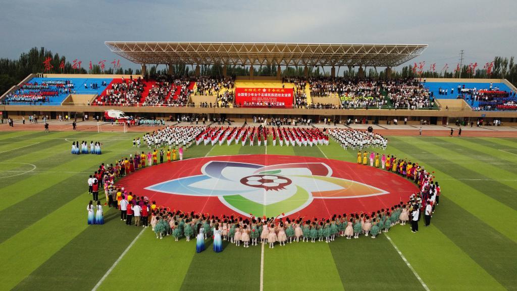 这是8月5日在新疆喀什市拍摄的全国青少年女子足球民族团结友谊赛开幕式现场(无人机照片)。新华社发(杜晓斌摄)
