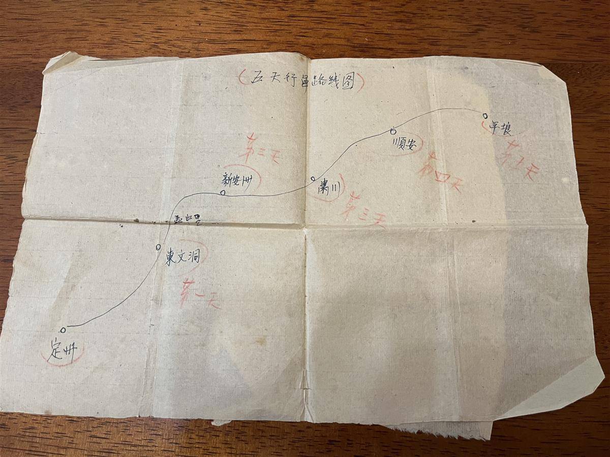 马发轩至今还保存着70多年前朝鲜战场上3张“行军路线图”,这3张路线图显示:从跨过鸭绿江到抵达战场,部队足足走了15天时间。记者看到,每张“行军路线图”都用中文标出了5天的行军计划,第一张是从中朝边境的新义州出发,5天后到达定州。第二张是从定州出发,5天后抵达朝鲜首都平壤。第三张是从平壤出发,5天后抵达物开。