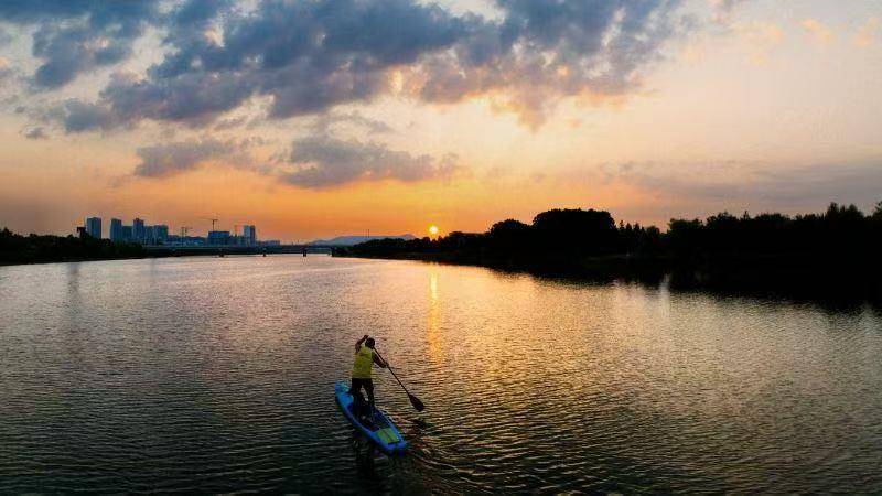 微风拂过,河面碎金闪烁,桨板人的剪影倒映水中,仿佛与自然融为一体。