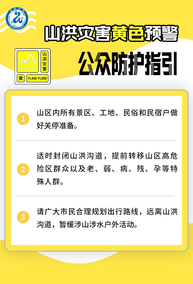 北京山洪灾害黄色、积水内涝蓝色预警发布