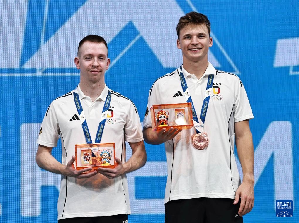 8月8日,德国队选手卡约、福格尔(右)在颁奖仪式上。
