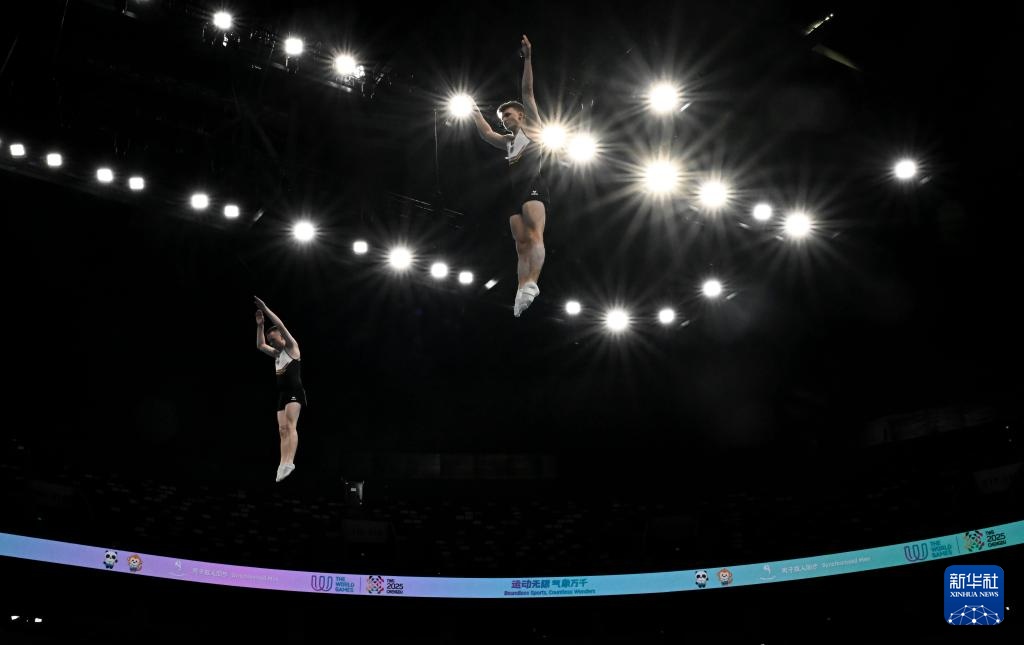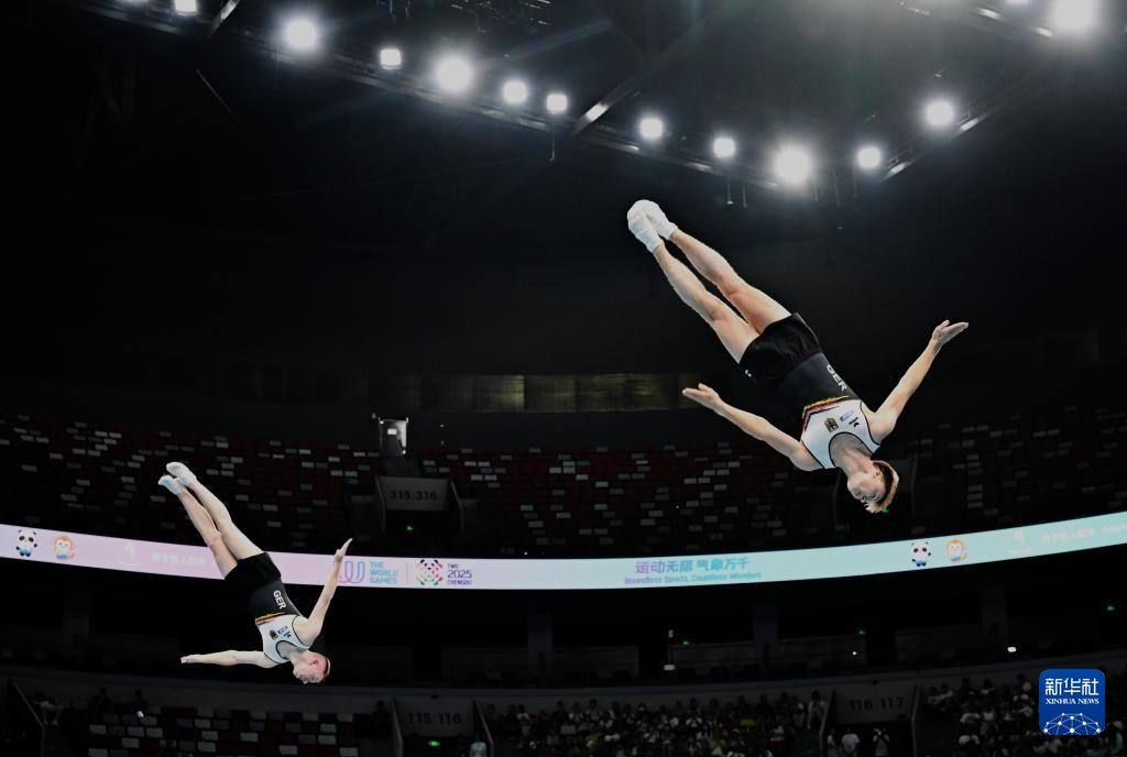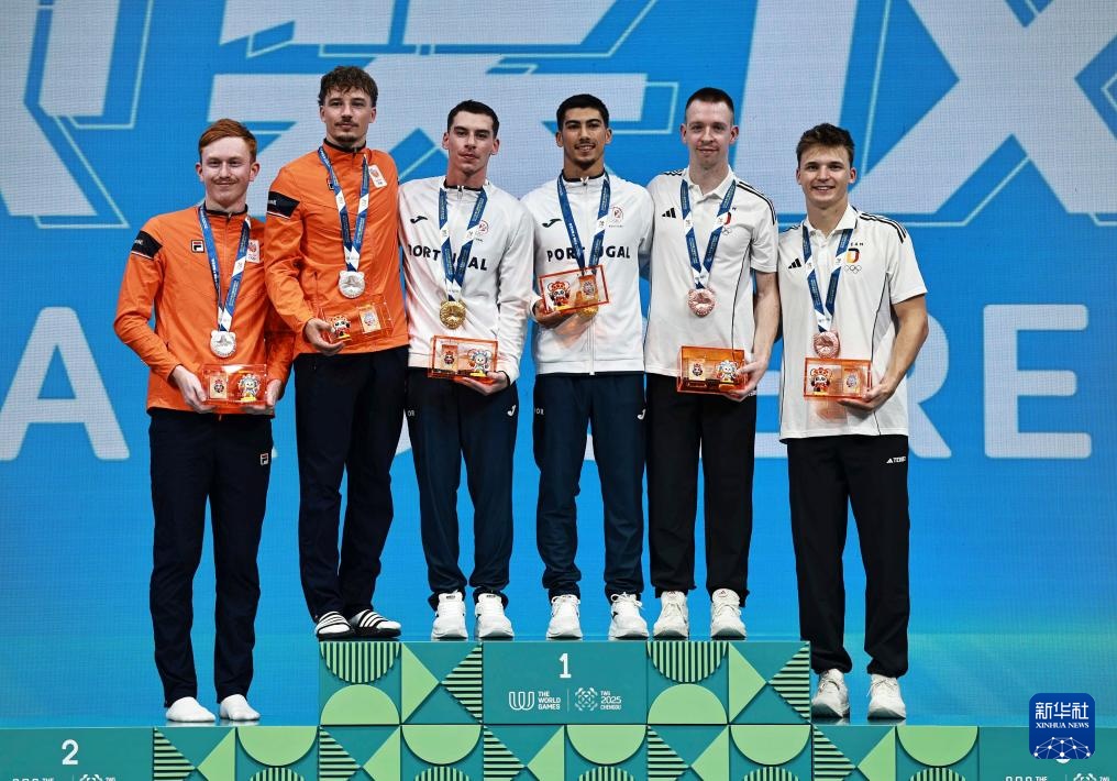 当日,2025年成都世运会蹦床男子双人同步决赛举行,葡萄牙队获得冠军,荷兰队获得亚军、德国队获得季军。