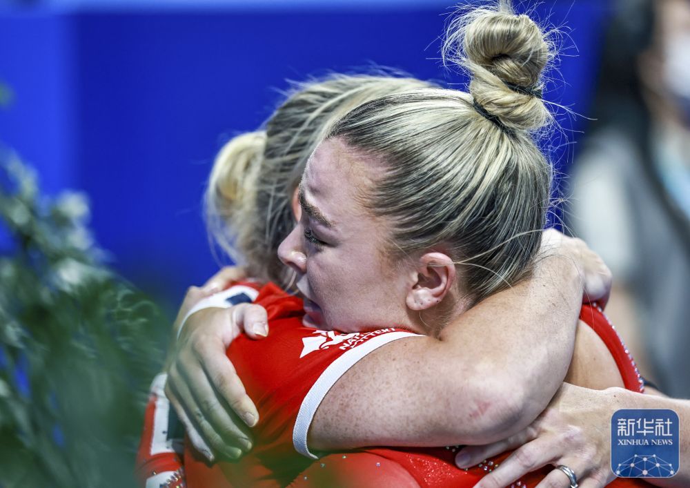 ↑ 冠军英国队选手基莉(右)与教练在比赛后拥抱庆祝。