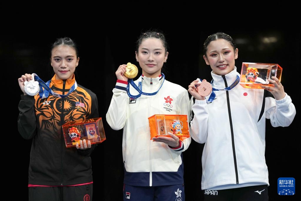 8月9日,冠军中国香港选手沈晓榆(中)、亚军马来西亚选手彭牬尔(左)和季军日本选手贵田菜花在颁奖仪式上。