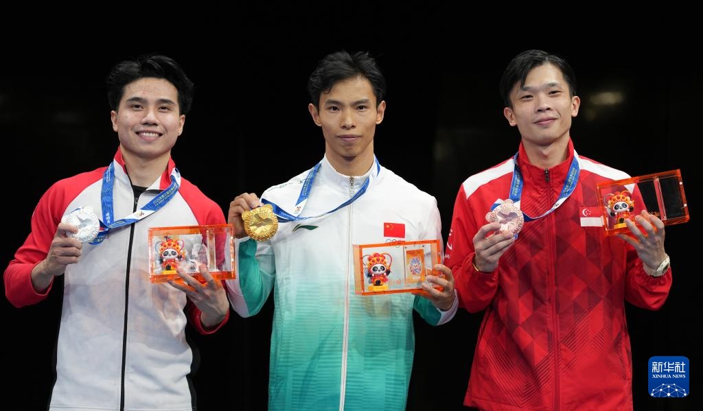 8月9日,冠军中国选手高久尚(中)、亚军印度尼西亚选手西雷加尔(左)和季军新加坡选手林思韦在颁奖仪式上。