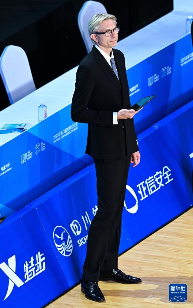 8月9日,拉脱维亚裁判辛金斯在比赛中观看选手们的表现。