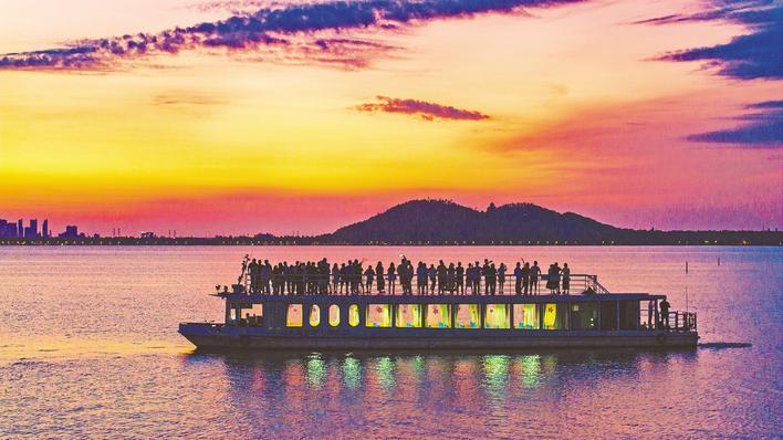 游客紧贴船舷,目光聚焦在东方微亮的天际线上。起初,天边只是淡淡晕染的粉橙色,渐渐地,一抹炽烈的金红刺透云层,金光泼洒在湖面上。相机快门声此起彼伏,惊叹声轻轻响起,人们沐浴在初升的光芒中,被温柔唤醒。摄影博主黄山几乎每天都来凌波门拍日出,他说:“在湖心迎接朝阳,仿佛太阳是专门为我升起,这感觉太奇妙了!”