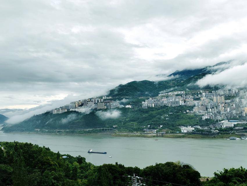 雨后的长江江面显得开阔平静,船只悠然地行驶在江面上,打破了江水的宁静,泛起层层涟漪。江水与山峦、城市相互映衬,构成了一幅和谐而美丽的峡江画卷。