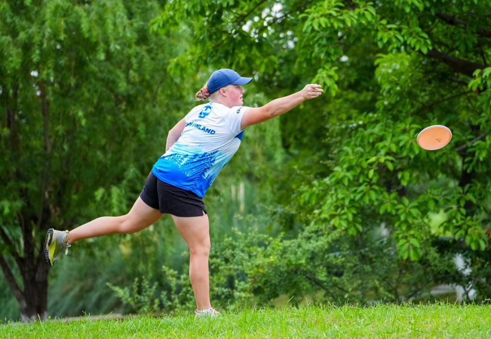 8月9日,芬兰队选手萨洛宁在比赛中掷飞盘。新华社记者 陈欣波 摄