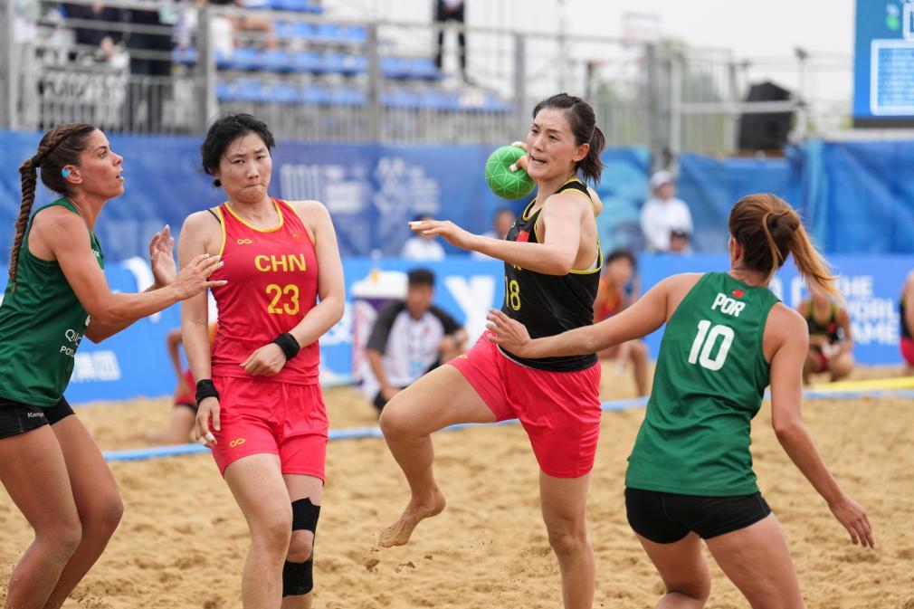 8月8日,中国队球员沈萍(右二)在比赛中进攻。当日,在2025年成都世运会沙滩手球女子预赛中,中国队不敌葡萄牙队。新华社记者 刘坤 摄