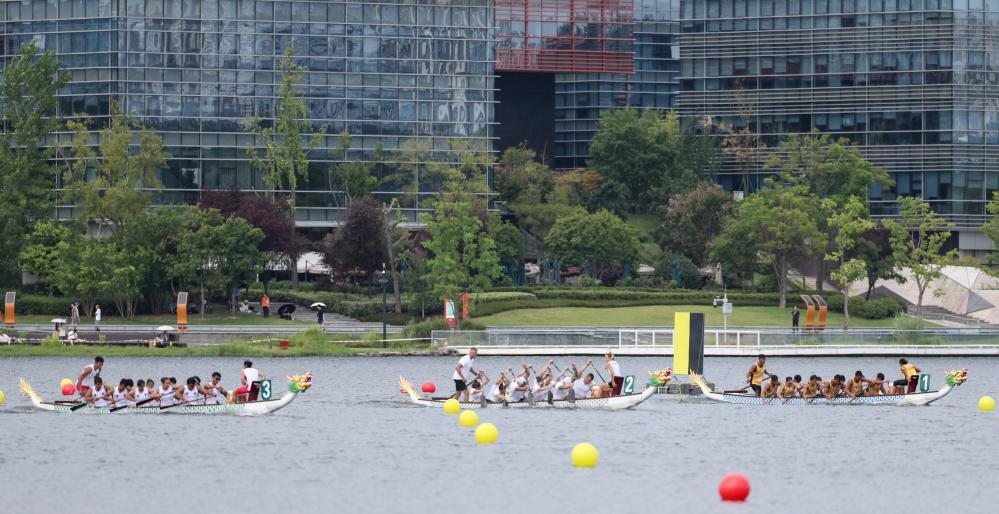 8月9日,龙舟比赛在兴隆湖湖滨赛场开赛。除龙舟赛外,皮划艇马拉松比赛也在同一赛场进行。观众们坐在湖边视野开阔的观赛席,为运动健儿们呐喊助威。