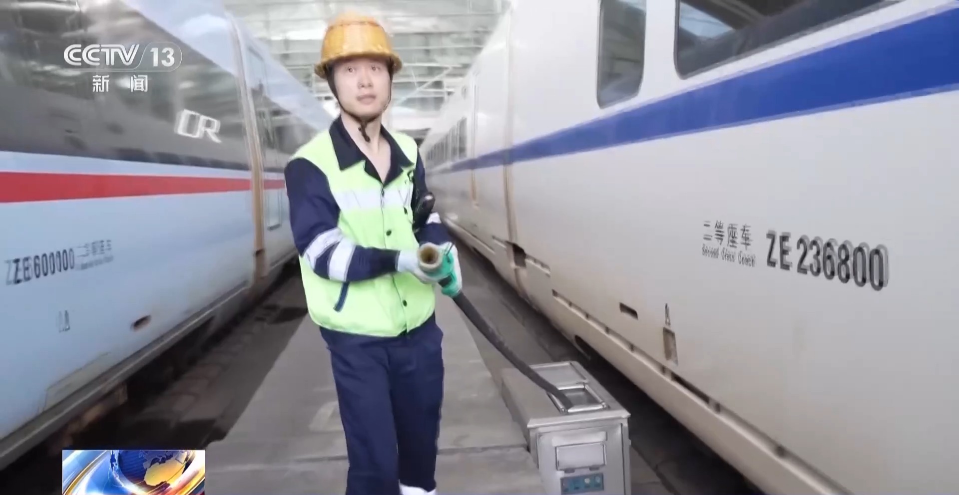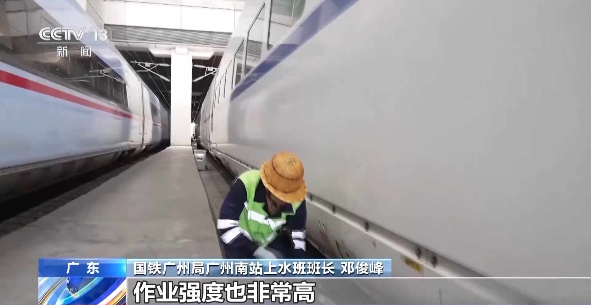 国铁广州局广州南站上水班班长 邓俊峰:像这种跨线列车,一般只有10分钟的作业时间,我们还要留出几分钟复检,所以对我们的作业要求也挺高,作业强度也非常高。